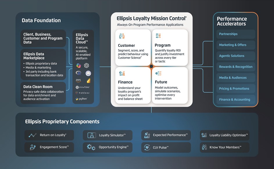 It draws from a sophisticated data foundation, integrating internal systems with external inputs like bank transactions and location data, via the Ellipsis Data Marketplace. All of it flows into Ellipsis Loyalty Mission Control®, where AI-powered components deliver real-time answers to the questions loyalty teams care about: is your program making money, keeping the right customers, and driving market share growth.